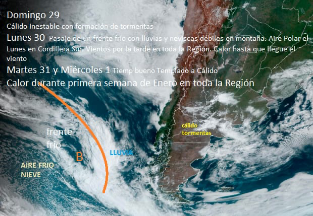 Esta ingresando un frente frío en la Patagonia desde el Pacífico. Lluvias débiles en Cordillera Sur y neviscas en montaña. Períodos de viento con ráfagas en Cordillera Región Sur Meseta Valles y Costa. Inestable en Meseta y Costa con algunas lluvias y tormentas dispersas.